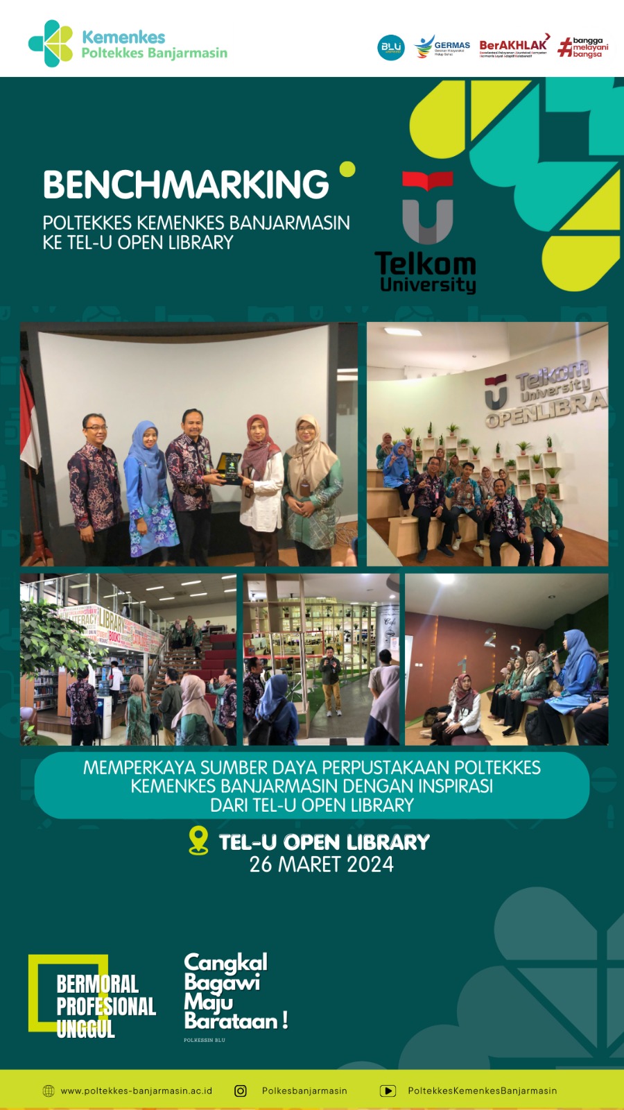 Benchmarking yang dilakukan oleh Poltekkes Kementerian Kesehatan Banjarmasin ke Perpustakaan Telkom University kemungkinan dilakukan untuk mendapatkan wawasan dan pengetahuan tentang sistem perpustakaan modern, teknologi yang digunakan dalam manajemen perpustakaan, serta praktik terbaik dalam layanan informasi dan literasi. Telkom University dikenal sebagai perguruan tinggi yang memiliki fasilitas perpustakaan yang canggih dan beragam sumber informasi, termasuk jurnal ilmiah dan koleksi digital. Dengan melakukan studi banding ke sana, Poltekkes Kementerian Kesehatan Banjarmasin dapat memperoleh ide-ide baru untuk meningkatkan layanan perpustakaan mereka serta memperdalam pemahaman tentang pentingnya literasi informasi dalam dunia kesehatan.