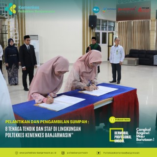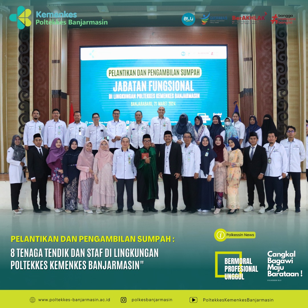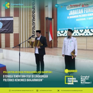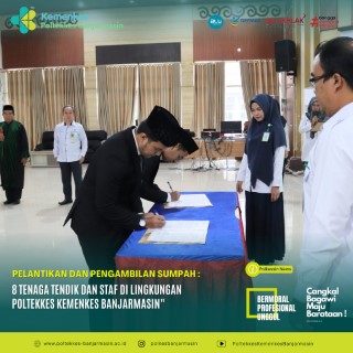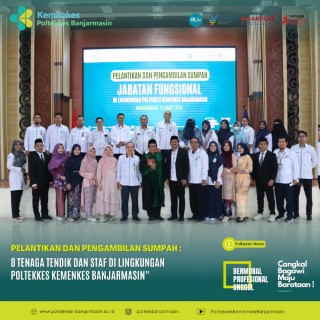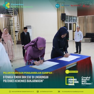 Telah dilaksanakan kegiatan pelantikan dan pengambilan sumpah jabatan fungsional pada hari Kamis, 21 Maret 2023 di Aula 2 Polkessin atas nama Raudatul Jannah, S.Kep., Ners., Muhammad Fadhil Rahman, S.Tr.Gz., Serli Dwi Nurhayati, S.Tr.Gz., Hilwatun Nisa, S.Tr.Kes., Siti Noor A'in A'fifah Puteri, S.Tr.KL., Noor Adha Aprilea, S.Tr.Kes., Herizka Rizty Emelia, S.Tr.Gz dan Muhammad Yusril Pratama, S.Tr.Kes.