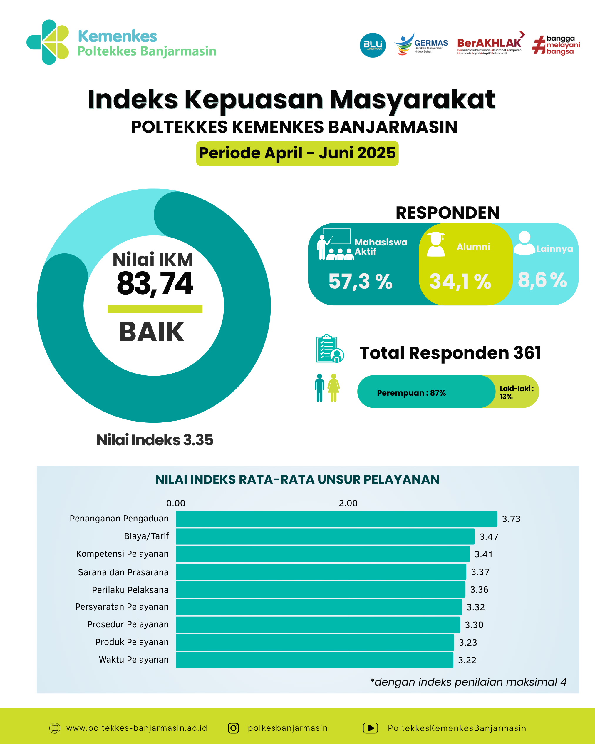 Dengan semangat BerAKHLAK, Poltekkes Kemenkes Banjarmasin berkomitmen untuk terus memberikan pelayanan terbaik. Masukan Anda menjadi motivasi kami untuk terus berkembang dan berinovasi! 🚀📊