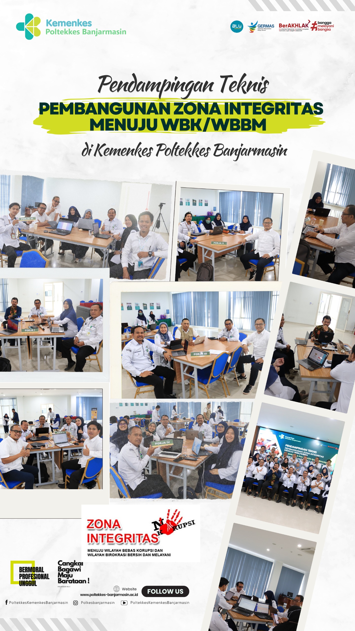 Acara yang dihadiri oleh seluruh jajaran pimpinan dan staf Kemenkes Poltekkes Banjarmasin ini bertujuan untuk memberikan pendampingan teknis yang komprehensif dalam implementasi Zona Integritas, sehingga Kemenkes Poltekkes Banjarmasin dapat mencapai predikat WBK dan WBBM.