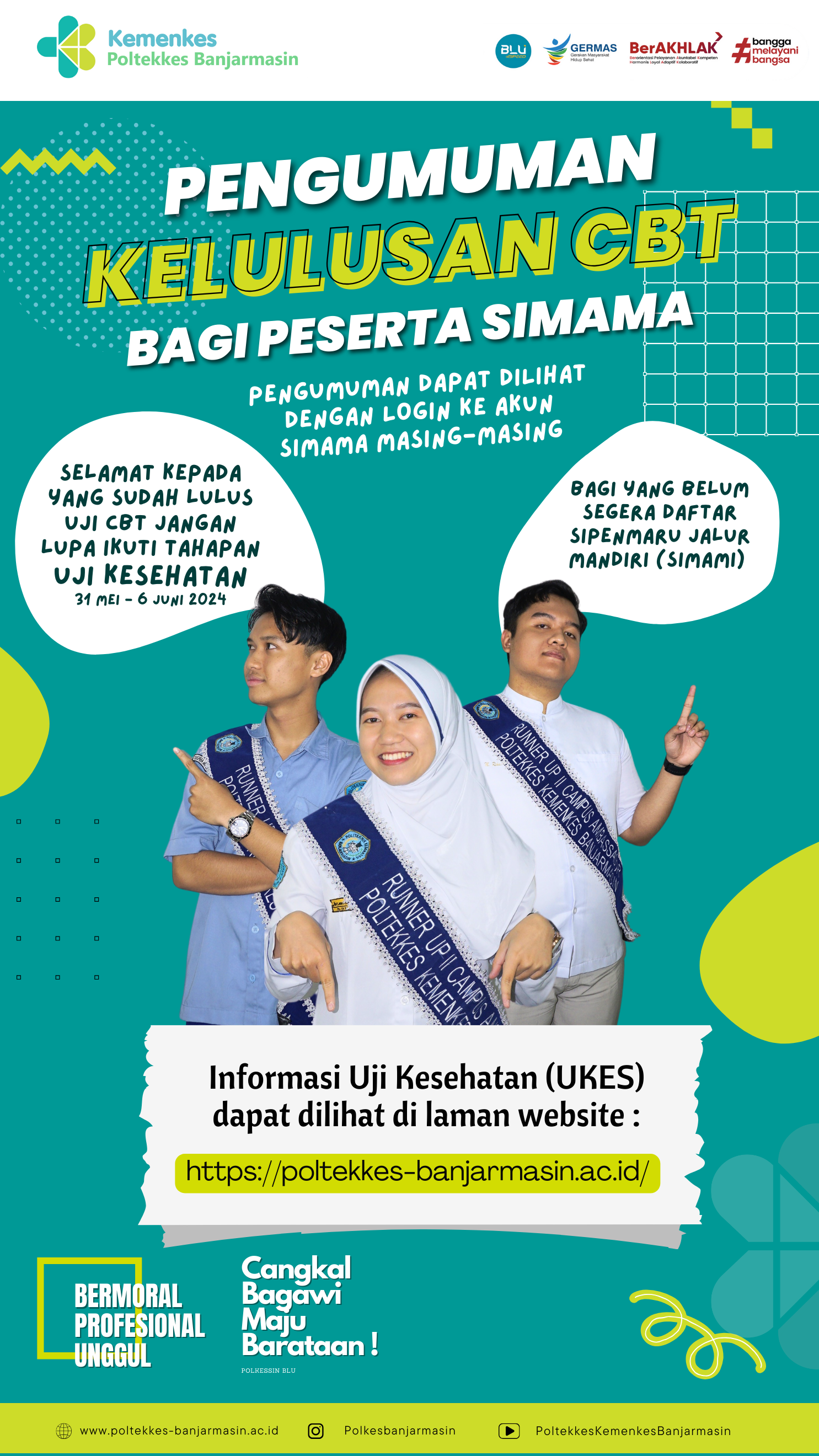 Laporkan segala bentuk tindak penipuan yang mengatasnamakan Panitia Penerimaan Mahasiswa Baru Poltekkes Kemenkes Banjarmasin!! Kami tidak menarik biaya selain yang diumumkan melalui website ini. resmi poltekkes banjarmasin